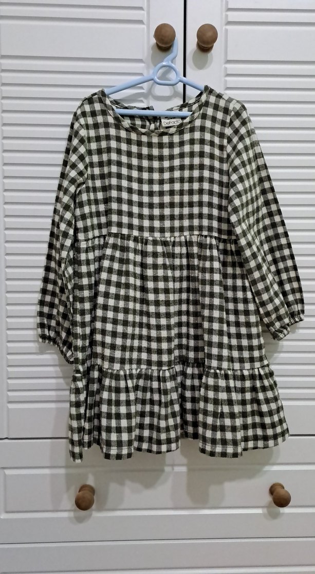 yesil kareli desenli, bol kesim midi elbise. Uzun kollu ve kayık yaka, yumuşak keten kumaştan üretilmiştir. Fırfır detaylarıyla günlük kullanıma uygundur.