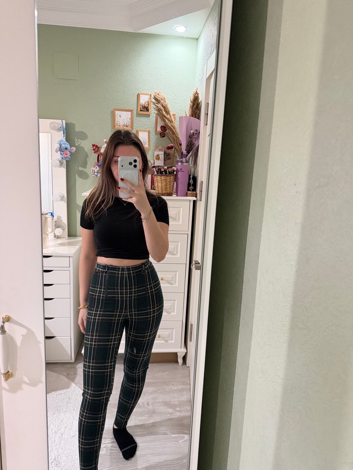 Yeşil Kareli Kadın Sigara Pantolon