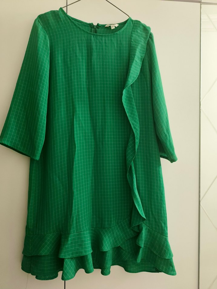 Yeşil kareli keten midi tunik, bol kesim ve yan ile etek uçlarında fırfır detaylıdır. Yuvarlak yaka ve kısa kolludur, parlak ve canlı renklidir. Arka taraf sağ altta ufak dikiş vardır. Uzunluk omuzdan 92 cm en orta kısımdan 50 cm. Hesabımdan diğer ürünlere bakabilirsiniz pazarlık sünnettir.