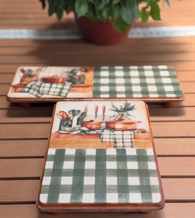 Koyu yeşil kareli desene ve mutfak gereçleri çizimine sahip, rustik görünümlü mutfak servis tahtası.transfer kullanılıp ekose tamamen elde yapılmıştır yağlı boyalarla tamamlanıp 3 kat verniklenmiştir
