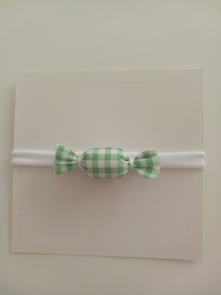 Beyaz lastik bant üzerinde pastel yeşil kareli şeker bulunan sade ve şirin bebek saç bandı.