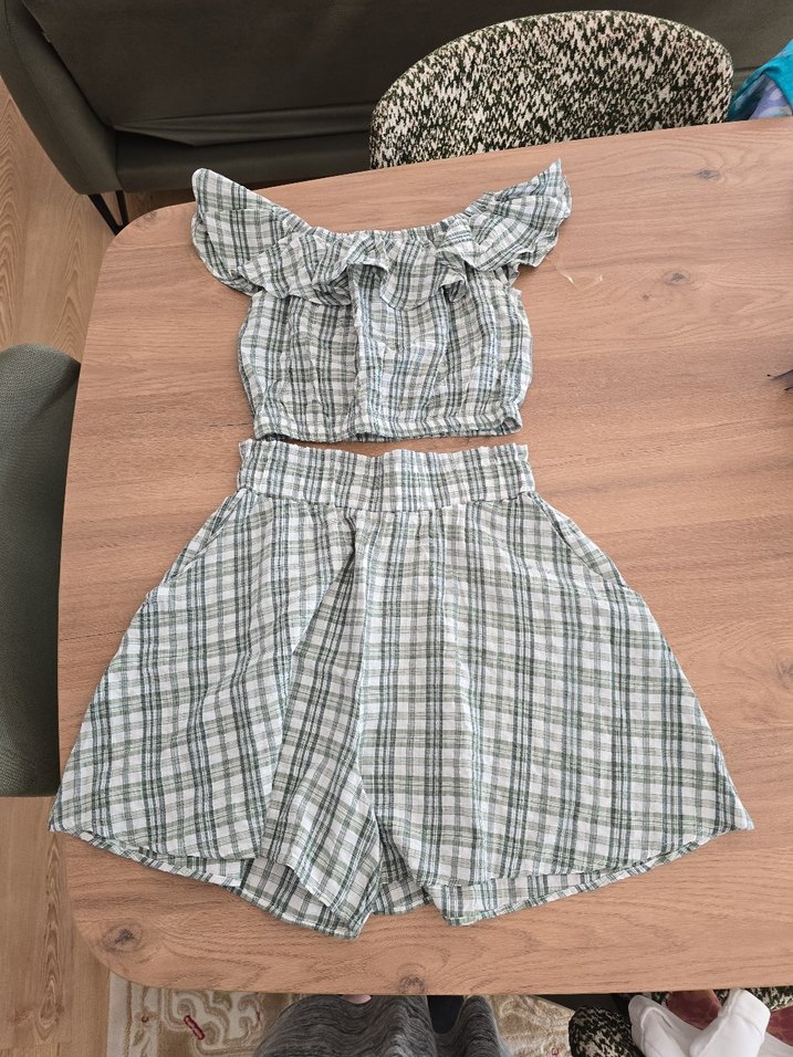 Gri kareli, straplez fırfırlı üst ve bol kesim şortdan oluşan iki parçalı takım.