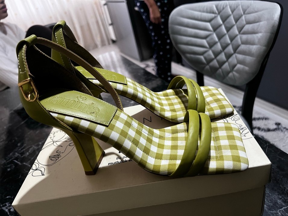 Yeşil Kareli Tokalı Blok Topuklu Kadın Sandalet
