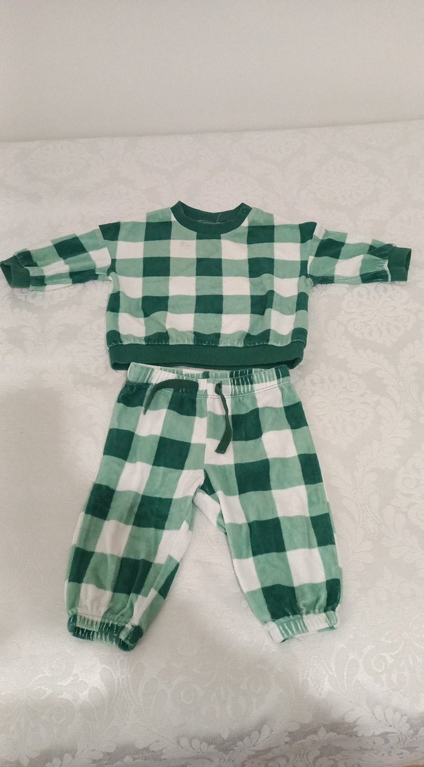 Yeşil ve beyaz kare desenli, uzun kollu ve bisiklet yaka bebek takımı. Yumuşak, örme tüylü kumaştan üretilmiştir. Elastik bel ve paça detayları vardır.