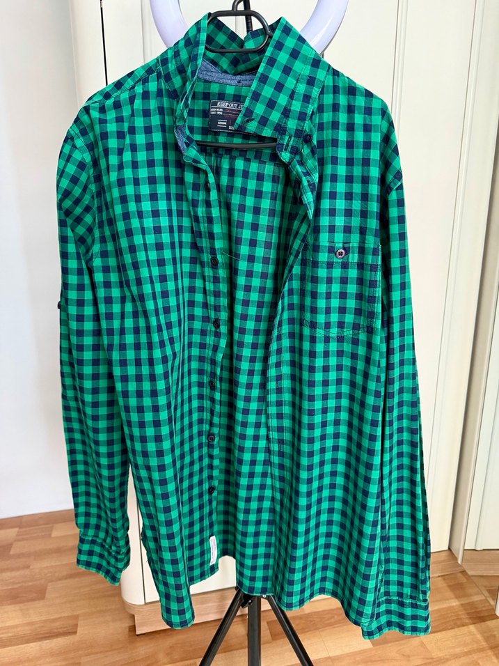 Düğmeli, uzun kollu ve yakalı erkek gömlek. Parlak yeşil kareli desene sahip, sentetik kumaştan üretilmiş. Günlük rahat kullanım için uygundur.