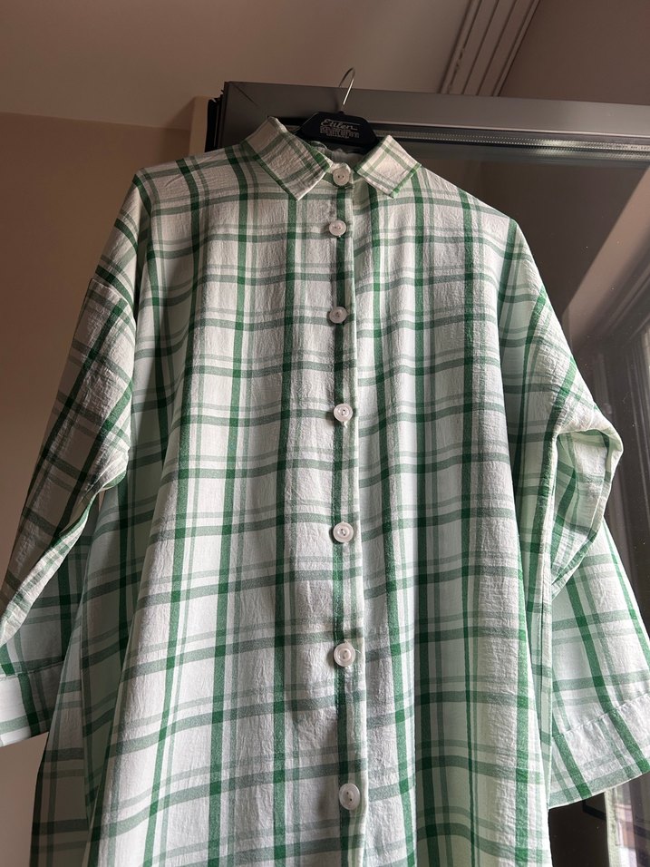 Düğmeli, uzun kollu gömlek. Yeşil parlak kareli desene sahip, salaş kesim ve yakalı, günlük rahat stil için uygun.