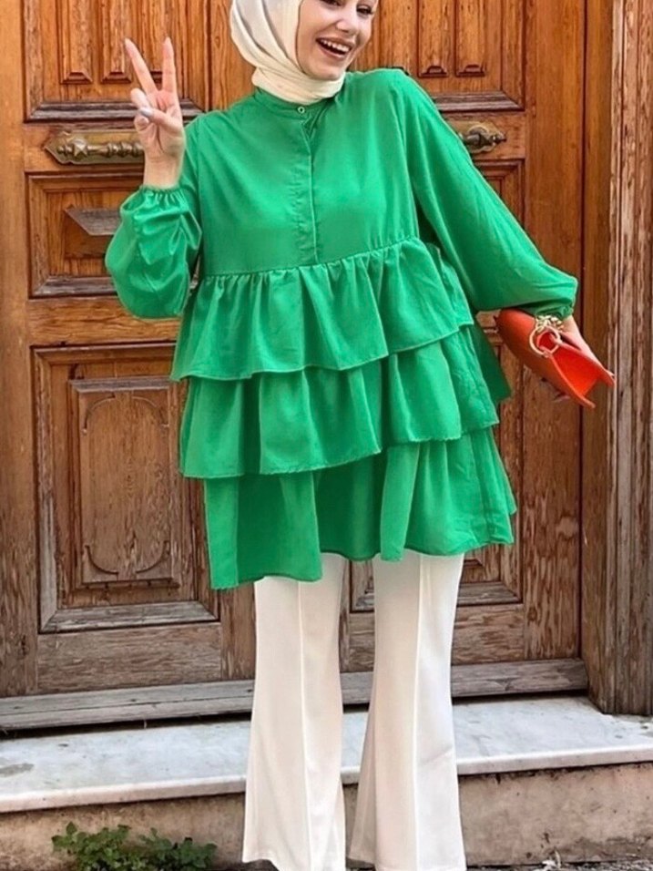 Yeşil Kat Kat Fırfırlı Bohem Mini Tunik