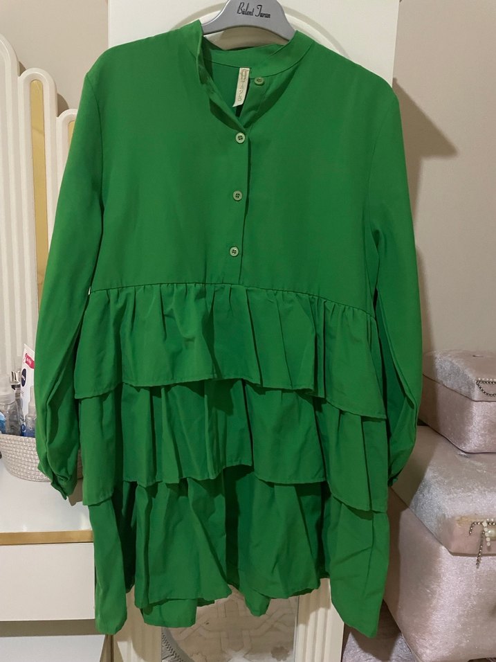 Yeşil renkli, uzun kollu, yuvarlak yaka ve kat kat fırfır detaylı bol kesim mini tunik. Pürüzsüz sentetik kumaştan, bohem tarz için günlük kullanıma uygun. Çok ufak bi delik var yakından bakmadıkva bellı bıle olmaz