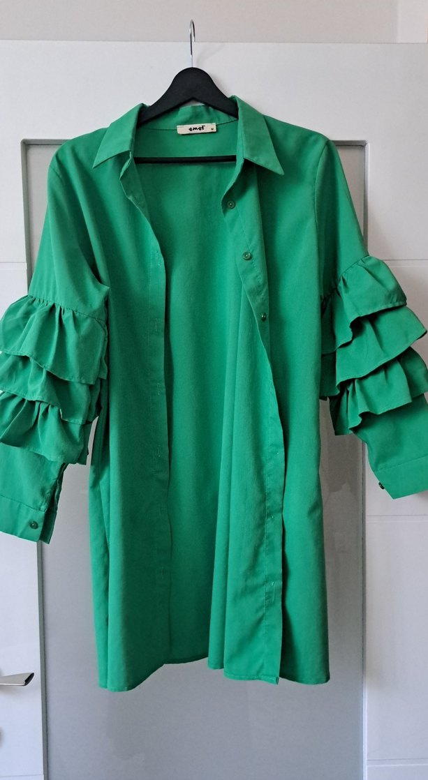 Uzun boy, katlı fırfırlı kollara ve çıtçıtlı detaya sahip yeşil salaş gömlek, yumuşak sentetik kumaştan üretilmiştir.