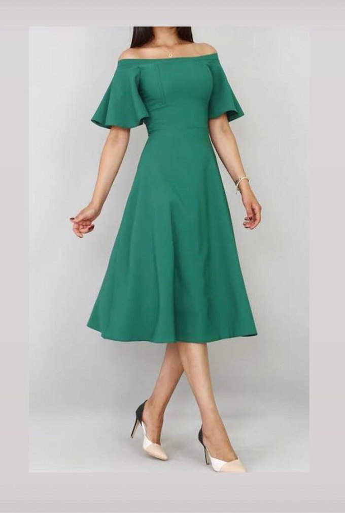 Yeşil Kayık Yaka Midi Abiye Elbise