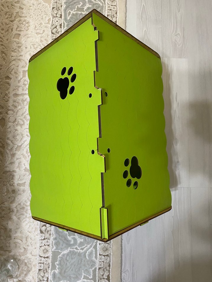Açık yeşil renkte, patili kesim detayları olan ahşap kedi evidir.kedim kullanmadığı için satıyorum yenidir