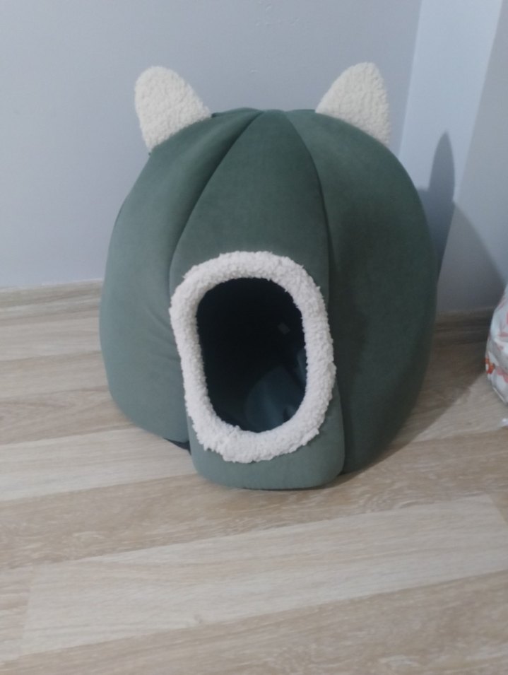 Yumuşak kumaşla kaplanmış gri kedi kulübesi, üzerinde küçük kulak şeklinde detaylar bulunur. Hiç Kullanılmadı Sıfır Yeşil Renk Kadife İçinde Minderide Mevcut Kedime Aldım Ama Yanından Bile Geçmedi