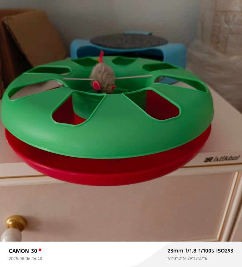 Üstünde fare figürlü yeşil kedi oyuncağı topu, kedinizin oyun oynaması için tasarlanmıştır.