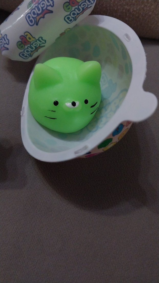 Renkli ve yeşil renkte, sevimli kedi şeklinde basit yüz detaylarına sahip yumuşak malzemeden yapılmış aksiyon figürü.