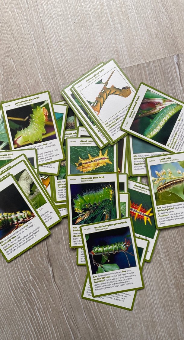 Çeşitli yeşil tırtılların detaylı görselleri ve bilgileri içeren eğitici kartlar, doğa hakkında öğrenmeyi artırır.