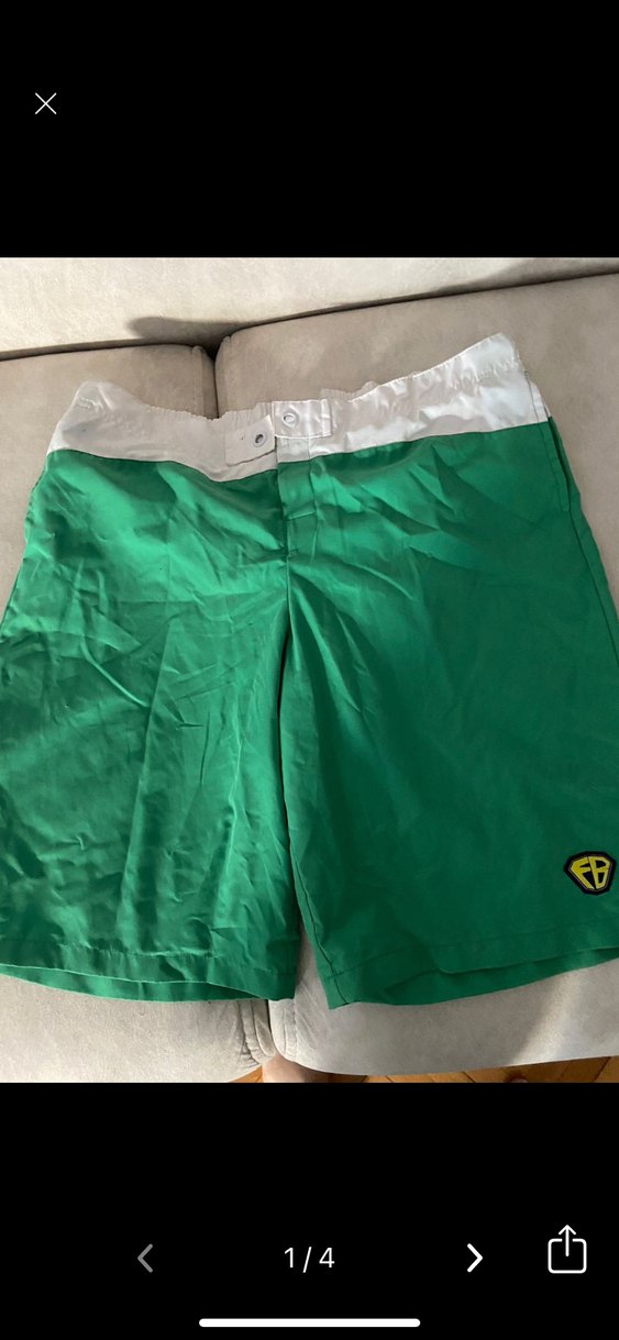 Parlak yeşil renkli, beyaz kemerli ve bel bantlı, rahat kesim erkek midi şort, plaj için uygundur.