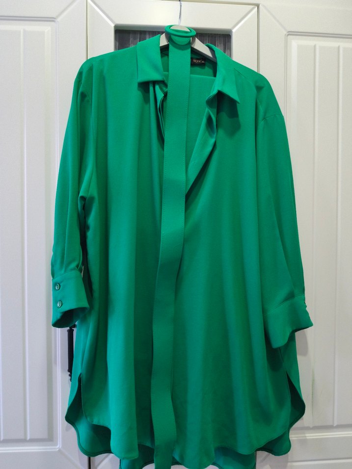 Uzun, bol kesim tesettür kemerli pantolon takımı , yakalı ve uzun kolludur. Işıltılı yeşil, ipeksi kumaştan yapılmış, drapeli ve ofis için uygundur.
