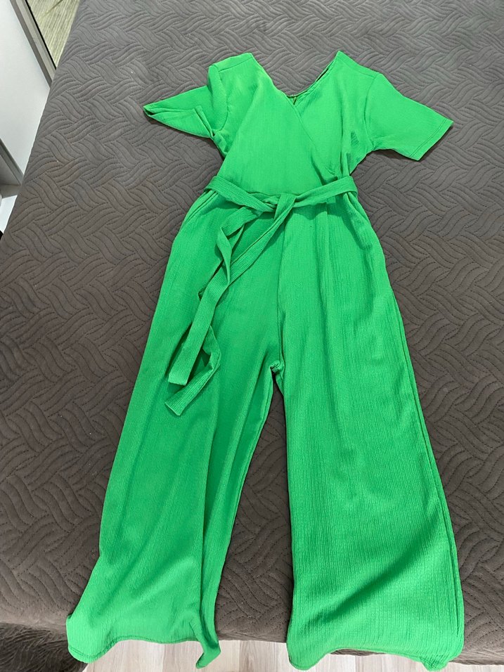 Yeşil renkli, kısa kollu, V yaka kadın tulum. Kemerli bel ve normal midi boy M beden 2 kez giyildi