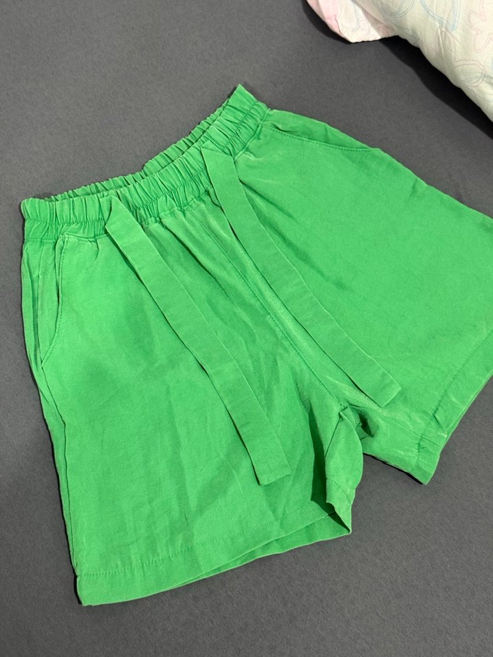 Kemerli, salaş kesim yeşil keten mini şort, sade tasarım ve kısa boy ile günlük kullanım için uygundur.