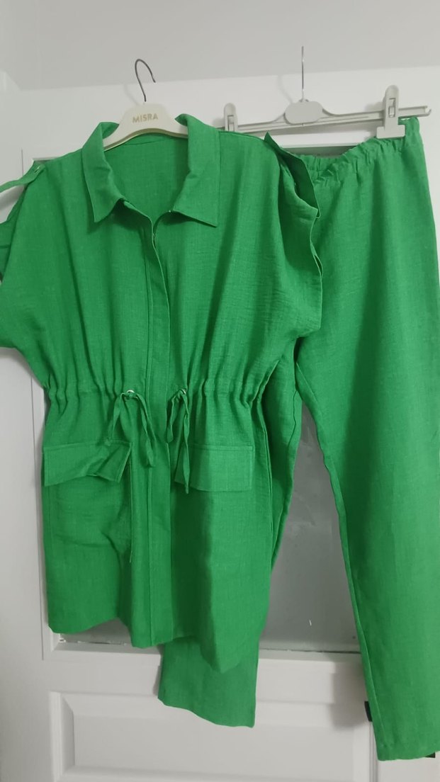 Yeşil renkli keten kumaştan, kısa kollu ve kemerli, bol kesim mini takımdır. Parlak görünümlü ve kesik yaka detaylıdır, günlük rahat stil için uygundur.