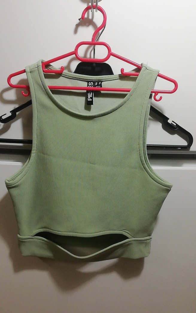 Yeşil renkte, yüksek yakalı ve kemerli, kısa kesim, vücuda oturan, sentetik kumaştan atlet. Spor ve sokak stili için uygundur. ♀️