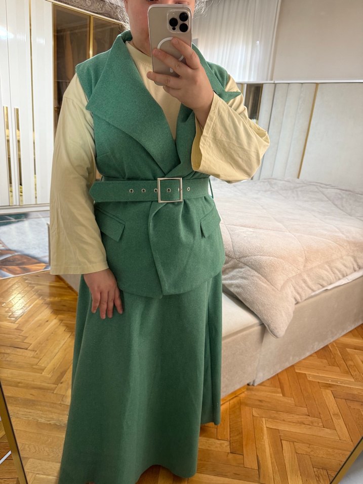 Uzun, kolsuz, yeşil keten kumaştan yapılmış, kemerli ve kesik yaka detaylı kadın takımı. Ofis için uygun, düzenli kesim ve desensiz tasarım.