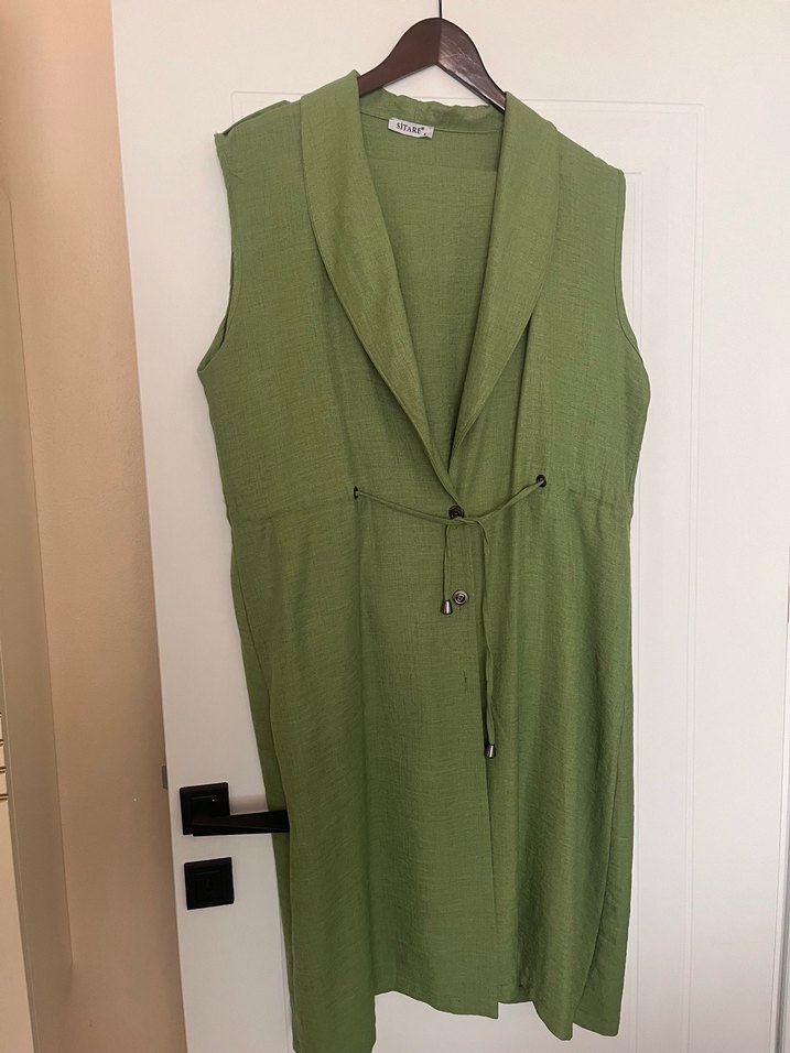Parlak yeşil keten kumaştan, kolsuz uzun yelek. Notlu yaka ve kemerli bel ile düzenli kesim. Minimalist ve modaya uygun sokak stili. Pantolon ikili takım pantolonda dikiş hatası var giyince gözükmüyor