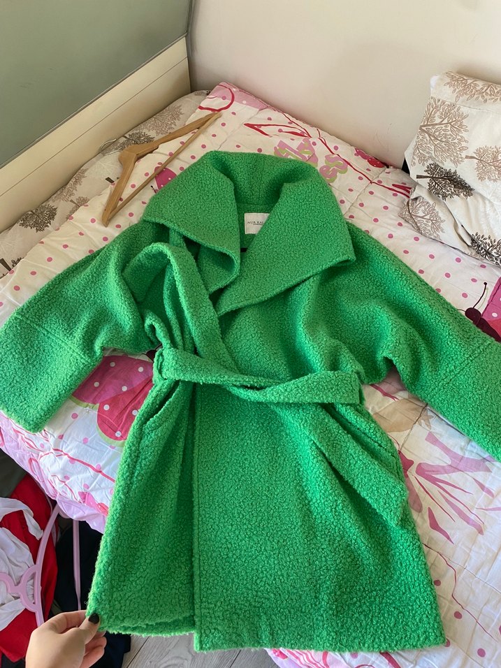 Yeşil renkli, yumuşak peluş kumaştan kemerli kaban. Geniş yakası ve rahat kesimiyle soğuk havalar için ideal.