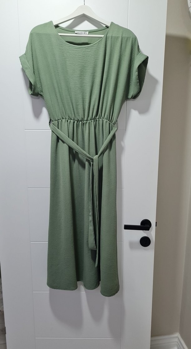 Bu pastel yeşil uzun elbise, kemerli ve bol kesimdir. Strappy kollu ve yuvarlak yakalıdır, yumuşak sentetik kumaştan yapılmıştır.