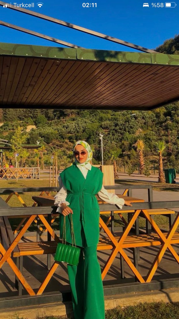 Yeşil renkte, kemerli ve uzun boy kadın takımı. Kolsuz, balıkçı yaka üstü etnik desenli ve sentetik kumaştan, rahat kesim. Günlük sokak stiline uygun. Ben 36 beden ile giydim ancak büyük beden takımdır 42 bedene kadar olur eşarp hediyedir