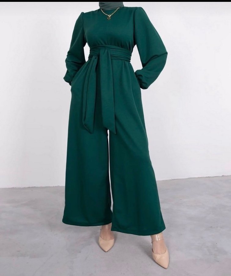 Yeşil renkli, kemerli ve yüksek yakalı uzun tulum. Uzun kollu, düz desenli ve rahat kesim, sentetik kumaştan üretilmiştir.