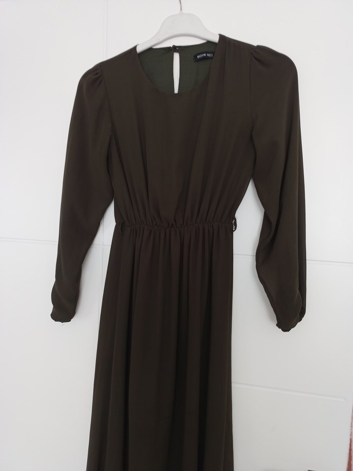 Yeşil uzun elbise, uzun kollu. Kemerli bel kısmı ve rahat kesimiyle ofis için uygundur. Modern klasik tarzda, sentetik dokulu kumaş kullanılmıştır. Kemeri yok birkaç yerinde teli kaçık