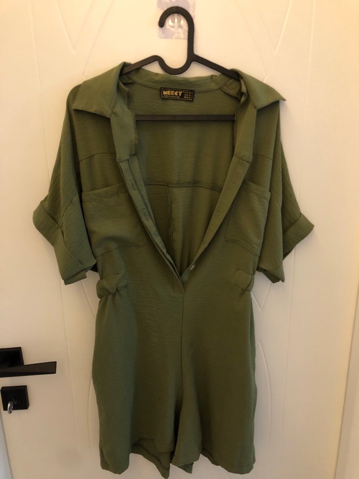 S-M uyumludur bir kez giyildi şortlu Yeşil keten kumaştan, bol kesim, V yaka, kısa kollu ve kemerli midi tulum. Parlak dokusu günlük kullanıma uygun şık bir görünüm sunar.