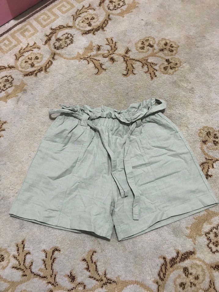Kemerli bel ve bol kesimiyle yeşil keten şort, rahat ve sokak stiline uygun. Pastel tonlu, dış mekan kullanımı için ideal.