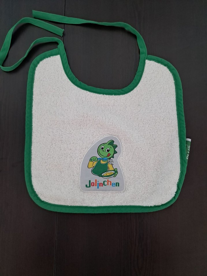Yumuşak beyaz kumaş üzerine renkli baskılı, yeşil kenarlı bebek önlüğü. .