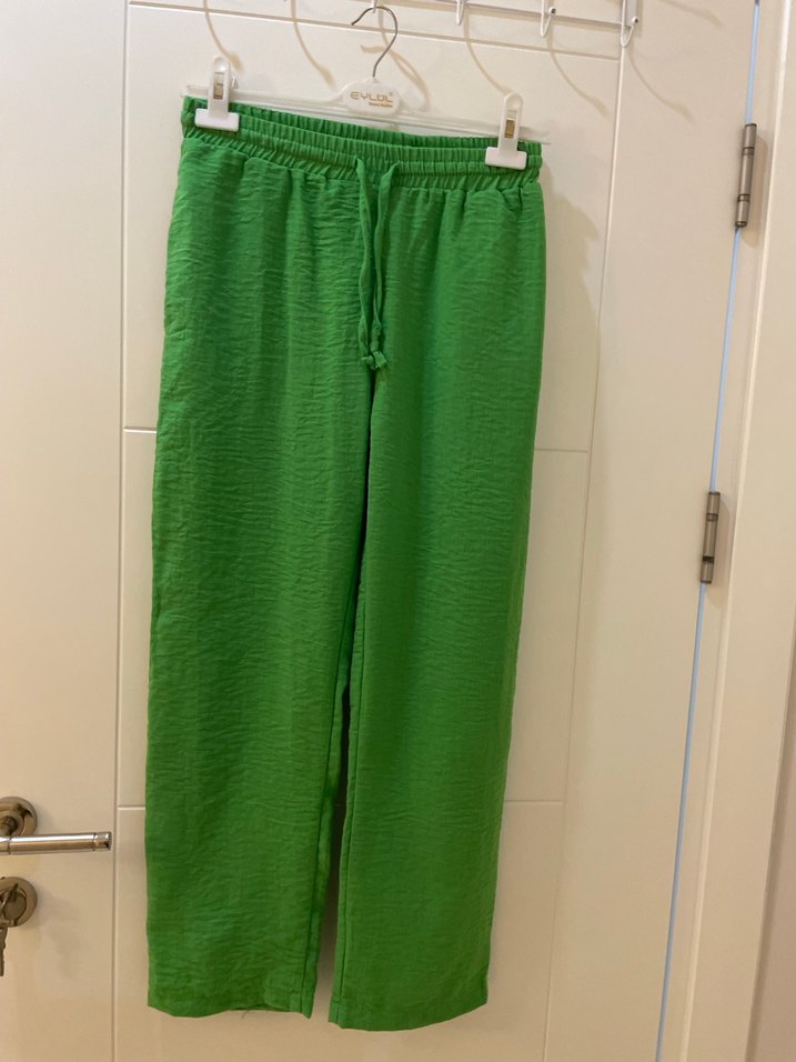Yeşil keten kumaştan, bol kesim ve normal midi boyda, parlak görünümlü rahat pantolon. Günlük kullanıma uygun, sade ve şık.