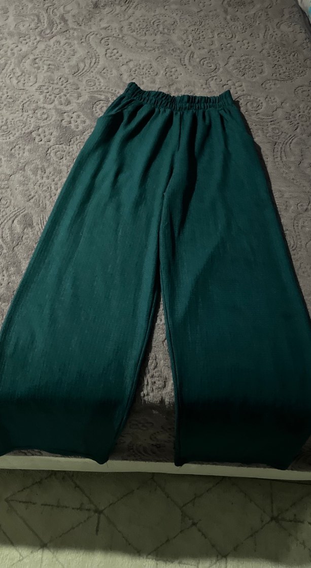 Koyu yeşil keten kumaştan, bol kesim ve pileli tasarımlı bu pantolon, rahat ve şık bir günlük sokak stili sunar.