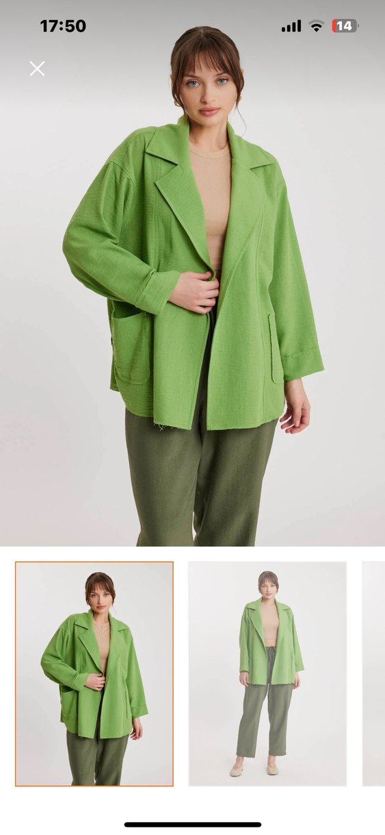 Açık yeşil keten ceketi, kesik yaka ve normal kesimle uzun kolludur. Minimalist, zahmetsiz şıklık sunar, günlük kullanım için uygundur.