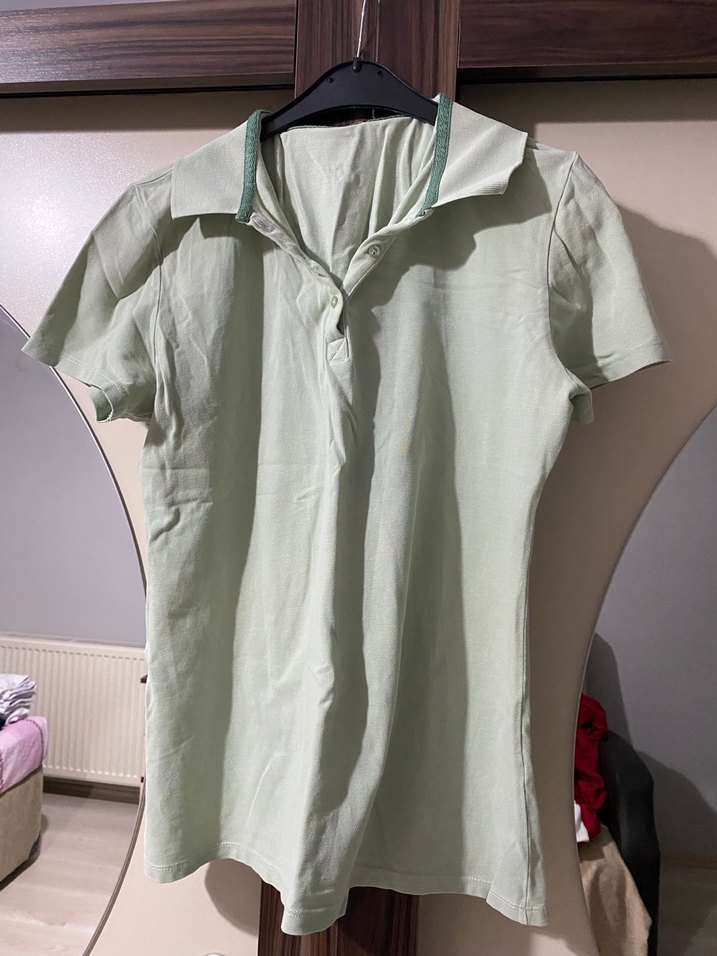 Yeşil keten kumaştan, düğmeli yakalı ve kısa kollu, normal uzunlukta, fit kesim tişörtü. Günlük rahat sokak stili için uygundur.