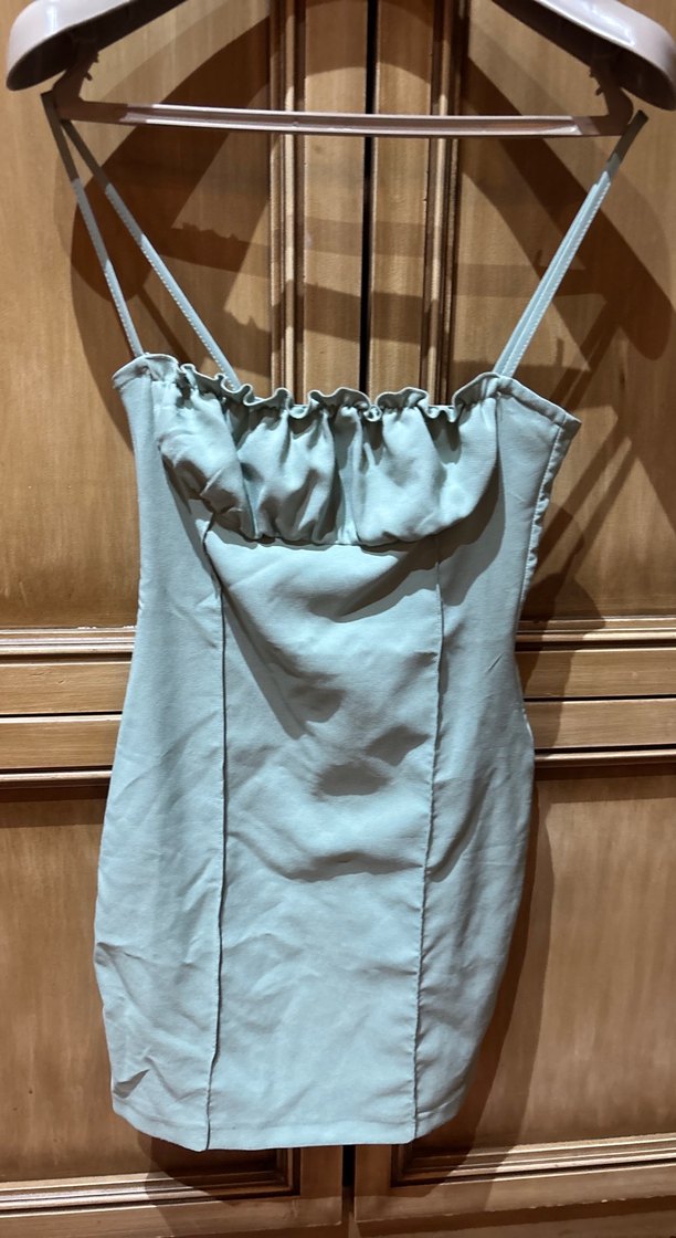 Yeşil keten mini elbise, askılı ve straplez yaka ile pilili detaylara sahiptir. Normal dizde boyda ve günlük kullanıma uygundur.