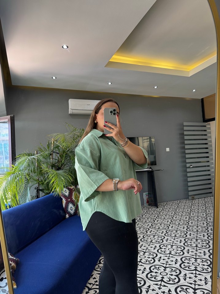 Keten kumaştan, kısa kollu, düğmeli ve yakalı yeşil gömlek. Rahat kesim ve normal boyda, günlük sokak stili için uygun.