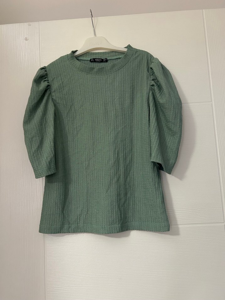 Yeşil Keten Kadın Bluz Pilili Kısa Kollu
