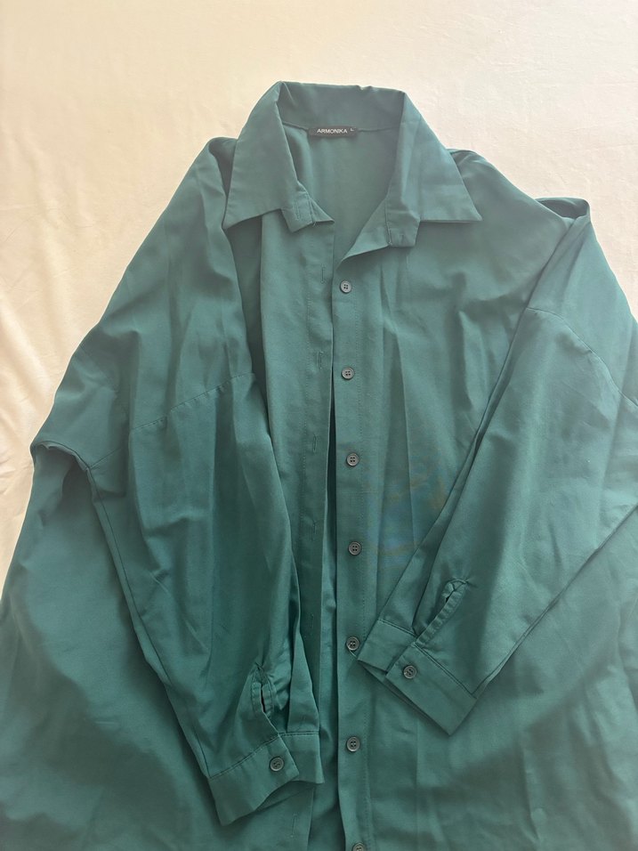 Yeşil renkli keten kumaştan, düğmeli, uzun kollu, yakalı ve normal midi boyda, bol kesim kadın gömleği. Minimalist ve sade tarzda, günlük kullanıma uygundur.