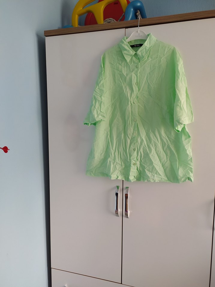 Rahat kesim, keten kumaştan kısa kollu kadın gömlek. Pastel yeşil renkte, yakalı ve düğmeli, günlük kullanıma uygun.