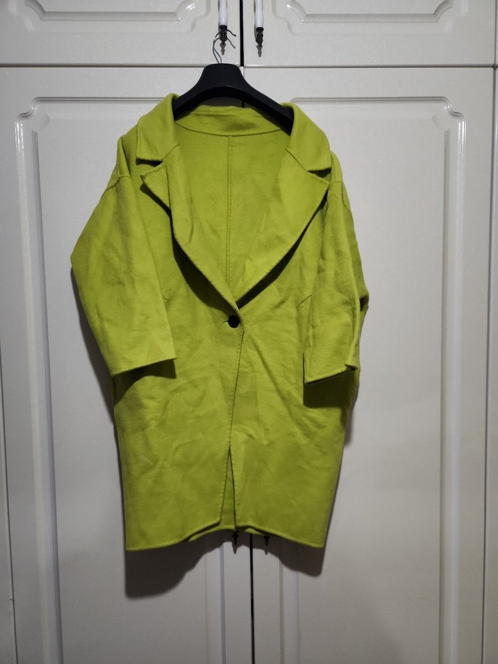 Yeşil keten kumaştan yapılmış, uzun kollu ve düğmeli, rahat kesim kadın ceketi. Minimalist ve sokak modasına uygun, günlük kullanıma uygundur.