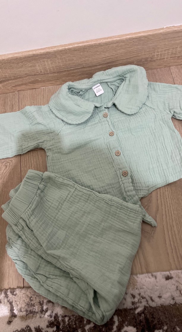 Yumuşak keten kumaştan, düğmeli, uzun kollu ve yakalı yeşil bebek takımı. Desensiz, bohem tarzda tasarlanmıştır.