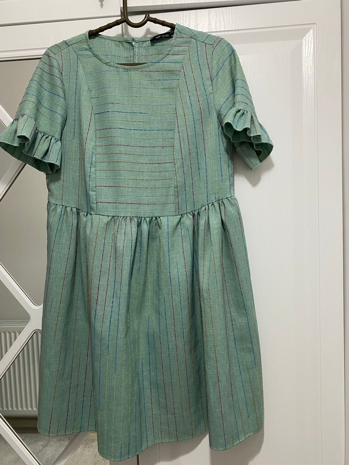 Kısa kollu, pilili, keten kumaştan yapılmış yeşil midi elbise. Salaş kesimi ve yuvarlak yakasıyla bohem tarzı yansıtır. Çok rahattır m l bedenler için uygundur