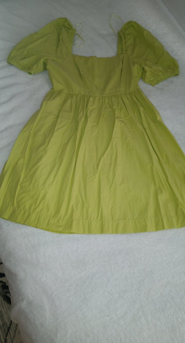 Keten kumaştan, kısa kollu, salaş kesim, yeşil midi elbise. Günlük kullanıma uygun rahat ve şık görünümlü.
