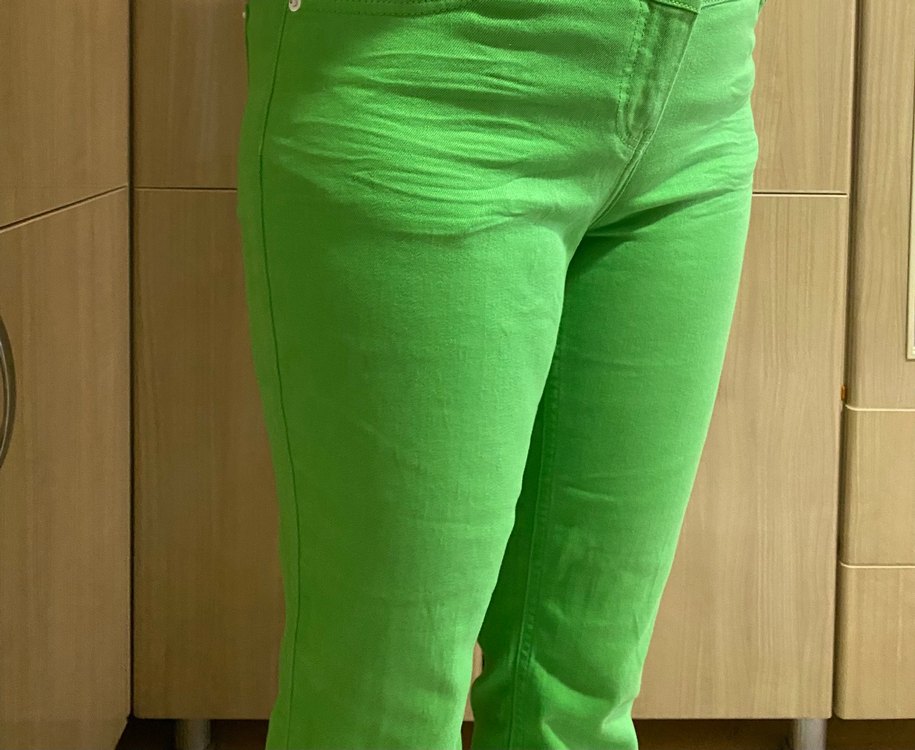 Parlak yeşil keten kumaştan, midi boy, vücuda oturan kadın pantolonu. Desensiz ve günlük kullanıma uygun, zahmetsiz şıklık sunar.