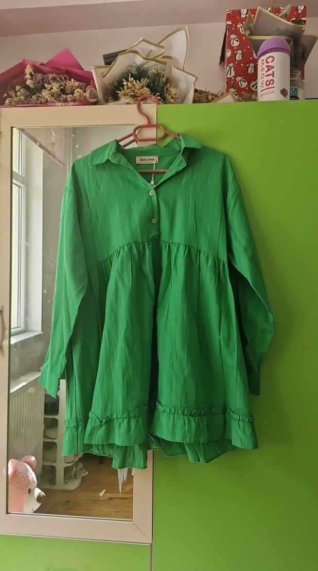 Yeşil keten kumaştan, bol kesim ve uzun kollu midi tunik. Yakalı ve uç kısmında fırfır detaylı, parlak görünümlü, günlük kullanıma uygun bohem tarzda.